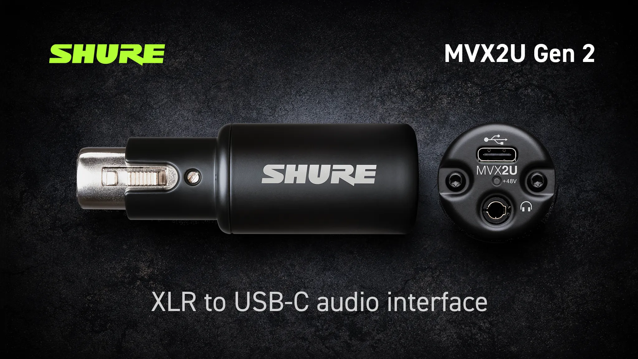 MVX2U Gen 2: одноканальний XLR-to-USB-C інтерфейс із вбудованим DSP; +60 дБ гейну, 48 V phantom, USB-C живлення, вага 100 г, 3,5 мм вихід для моніторингу без затримки; сумісність: Windows 10+ / macOS 14+, iOS 17+ (MFi) / Android 14+.